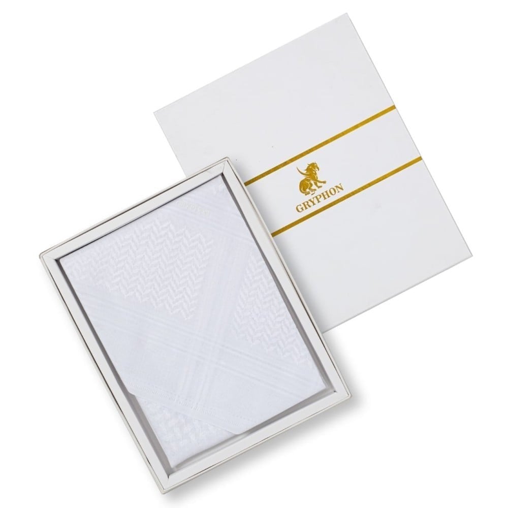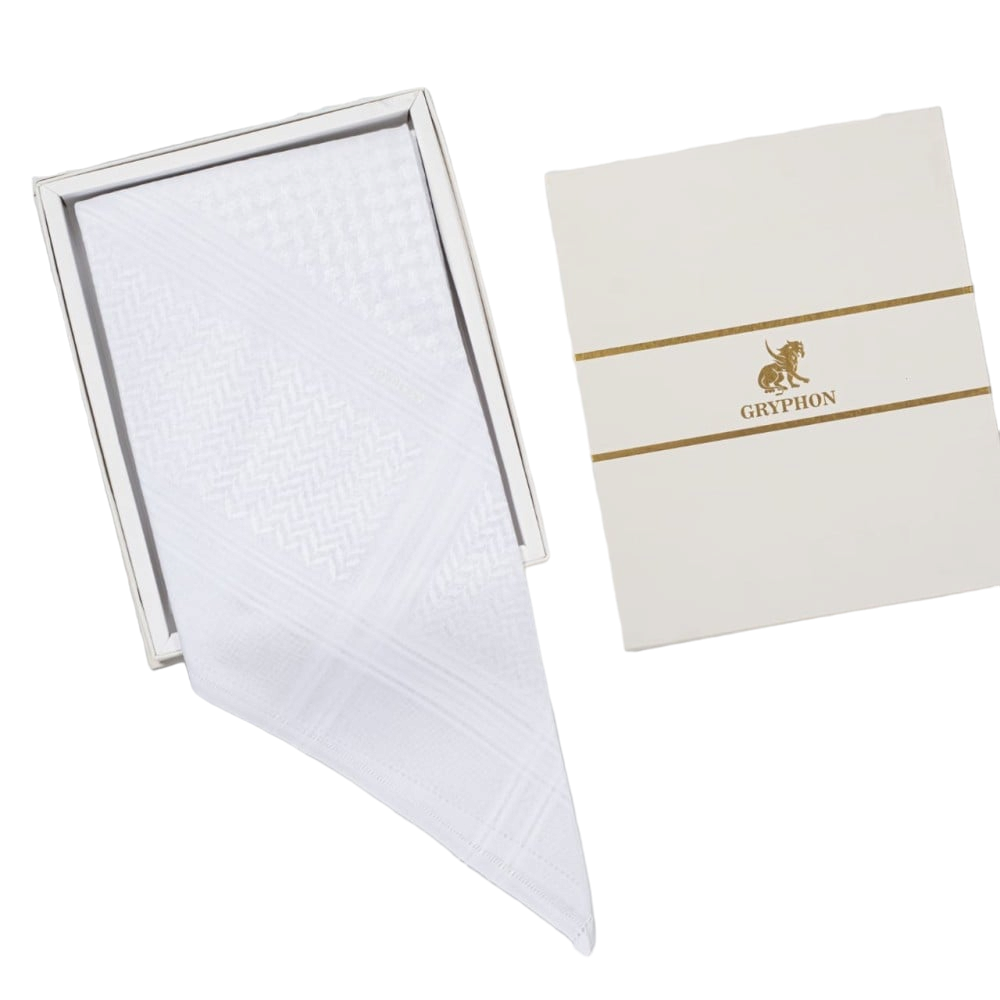 شماغ ابيض كلاسيك قريفون G19 من ماركة قريفون GRYPHON، شماغ ابيض يتميز بتناغم نسيجة ليمنحك حضور مختلف يجمع بين الأناقة والأصالة . تم تصميم الشماغ الابيض بمعايير أوروبية في صناعة الشماغ الأصلي والذي يمنحك مظهراً انيقاً، وتتميز أطراف الشماغ بأنها متطابقة ومحكمة بطريقة دقيقة تزيد من كمال مظهر الشماغ وجماله تفاصيل ومواصفات شماغ ابيض من قريفون: