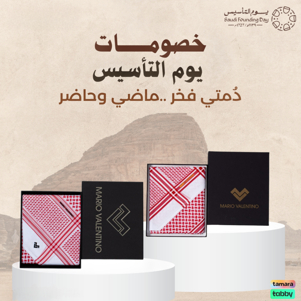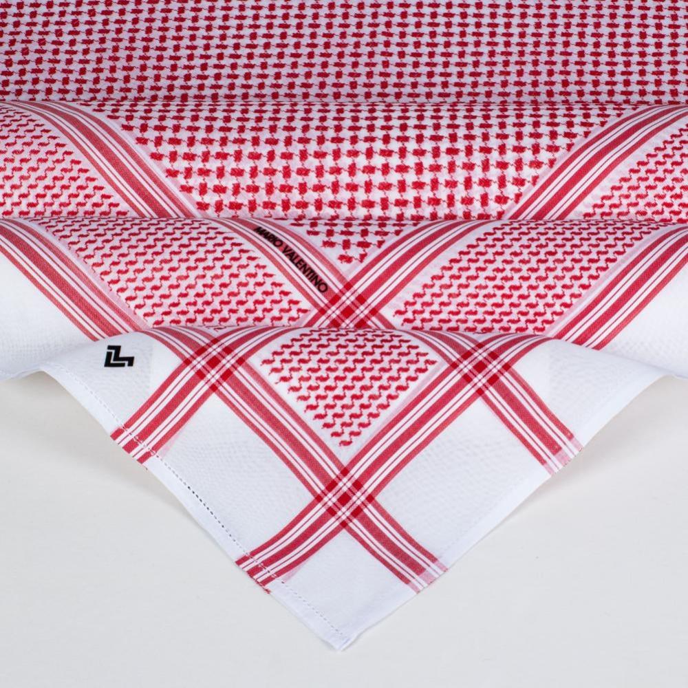 شماغ ماريو فالنتينو قولد الذهبي اخراصدار حيث الجودة العالية والنقوش العربية الأصيلة الذي تظهر اصاله وعراقه التراث الخليجي العربي والألوان الزاهية المداخلة بين الأحمر والأبيض فيظهر الشماغ كلوحة اصيله فنية جميلة للتراث العربي.