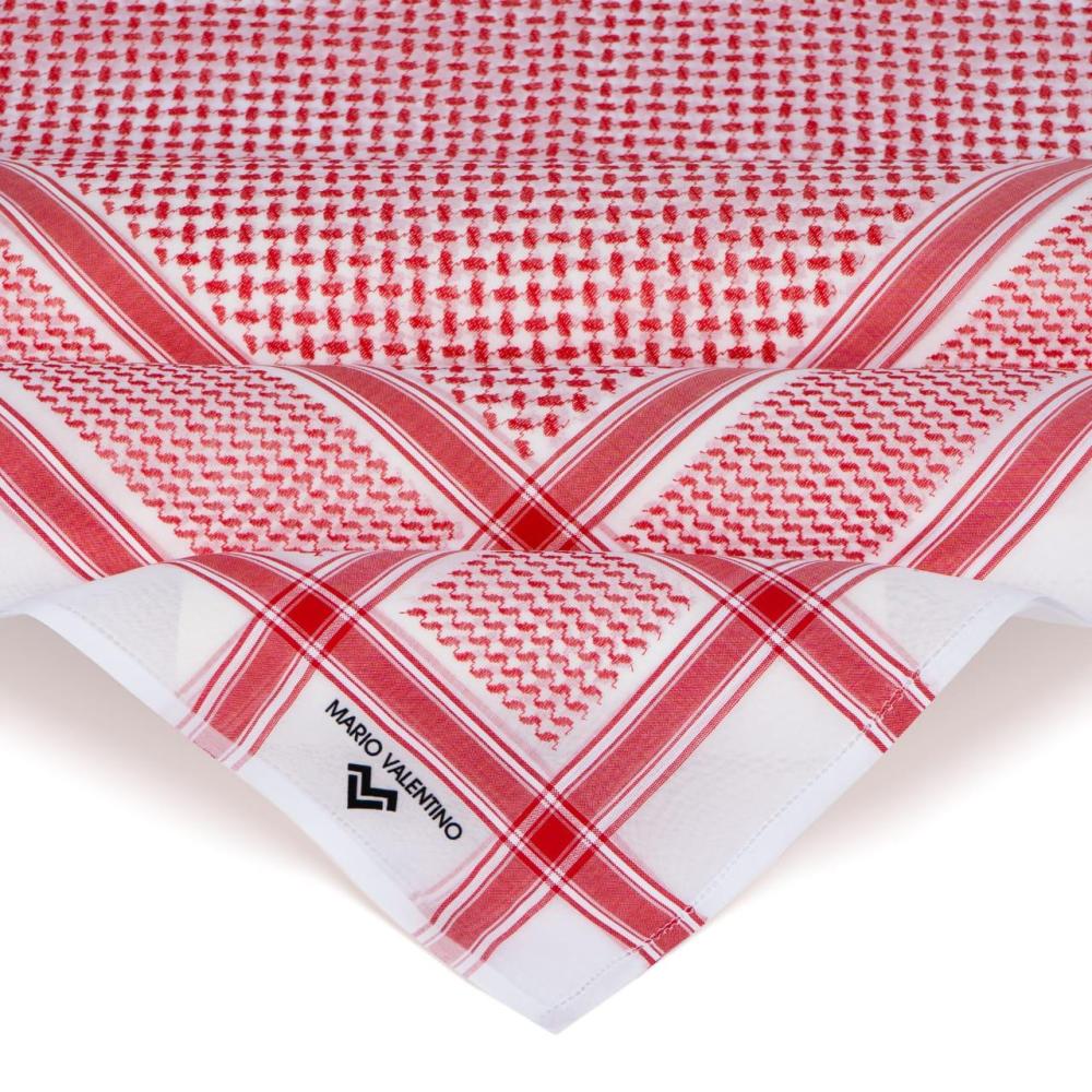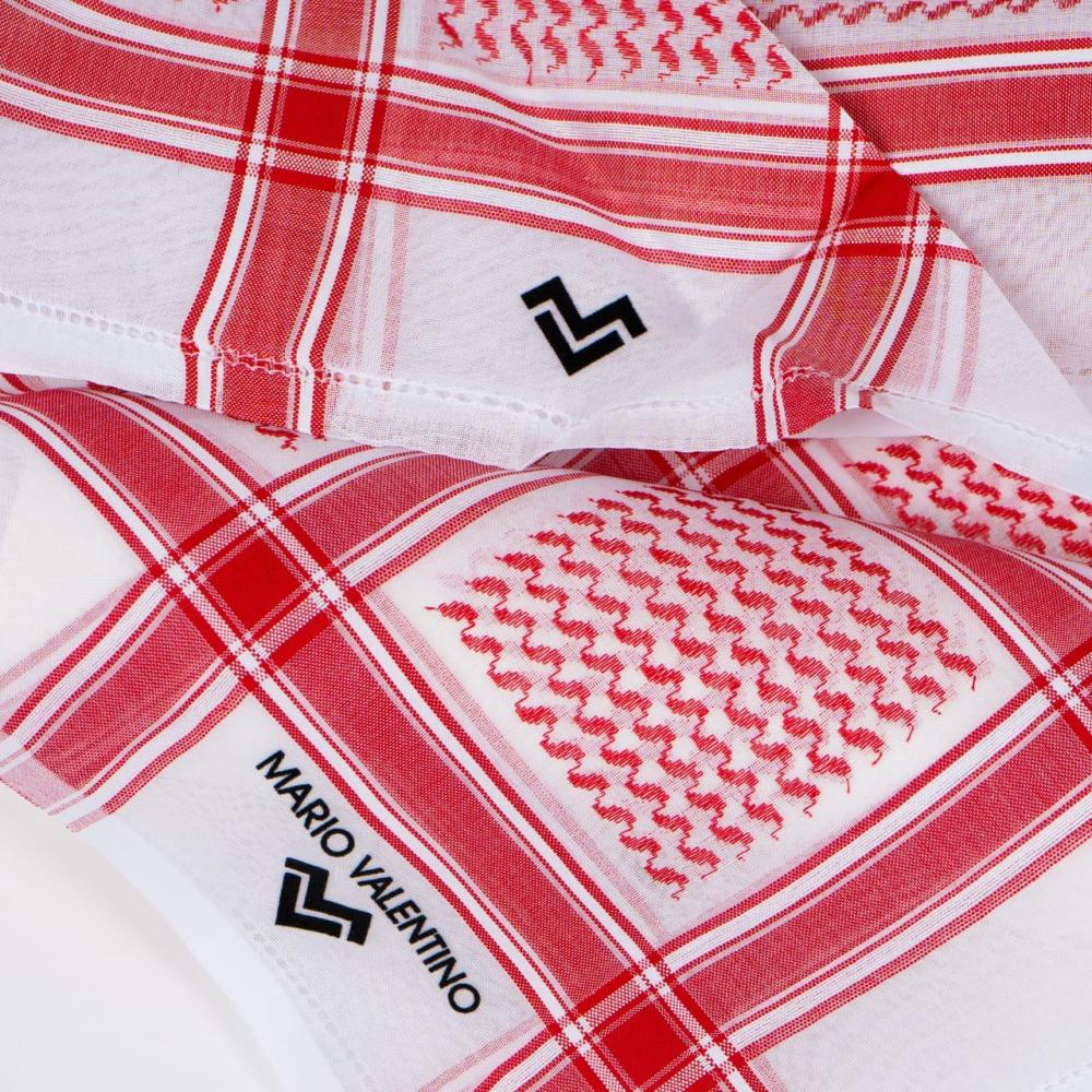 شماغ بتصميم عربي أصيل مصنوع من خامات عالية الجودة يدخل في تصنيعه خيط من القطن الصافي 100% مصبوغ بلون أحمر ذو صبغة ثابته وباللون الأبيض الناصع مع ختم أصلي واضح لشماغ ماريو فالنتينو باللون الذهبي.